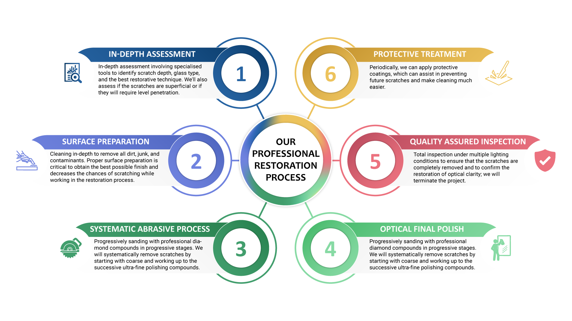 Don't spend a lot of money on glass windows, doors, or surfaces for replacement when you can have them restored like new with professional scratch removal, all at a fraction of the replacement cost. Our specialised glass restoration services remove scratches, scuffs, and surface damage while maintaining the integrity of the original glass.